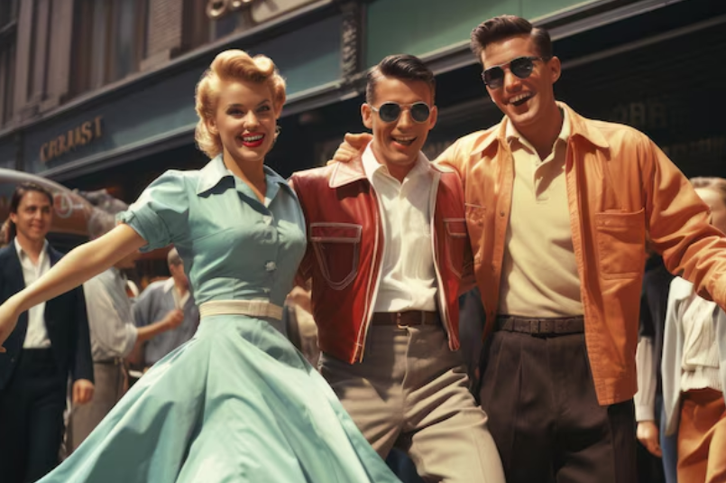 1950’ler, savaş sonrası refahın artmasıyla feminenliğin yeniden ön plana çıktığı bir dönemdi. Christian Dior’un “New Look” akımıyla geniş etekler, dar bel korseleri ve romantik siluetler moda oldu. Kadınlar pastel tonlarda elbiseler giyerken erkekler klasik takım elbiseleri daha modern kesimlerle tercih etti. Gençler arasında ise Rock’n Roll kültürüyle deri ceketler, kot pantolonlar ve tişörtler popülerleşti.