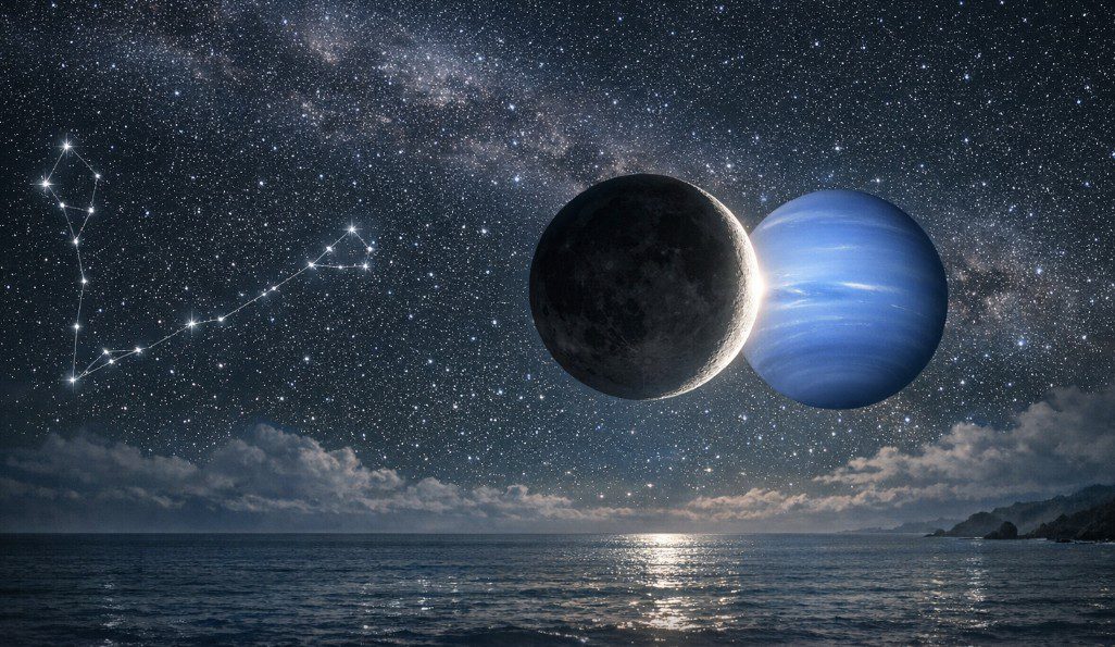 Ay’ın Neptün ile kavuşumu, bu Yeni Ay’a mistik ve hayalperest bir atmosfer katar. Neptün, sınırları eriten, gerçekliği bulanıklaştıran ve hayalleri besleyen bir gezegendir. Ay ile birleştiğinde duygular yoğunlaşır, sezgiler güçlenir ve rüyalar sembolik mesajlarla dolup taşar. Bu kavuşum, ilham verici sanat çalışmalarına, yaratıcı yazılara ve ruhsal vizyonlara kapı açar. Ancak aynı zamanda gerçeklikten kaçış, yanılsamalar ve belirsizlik riskini de beraberinde getirir.