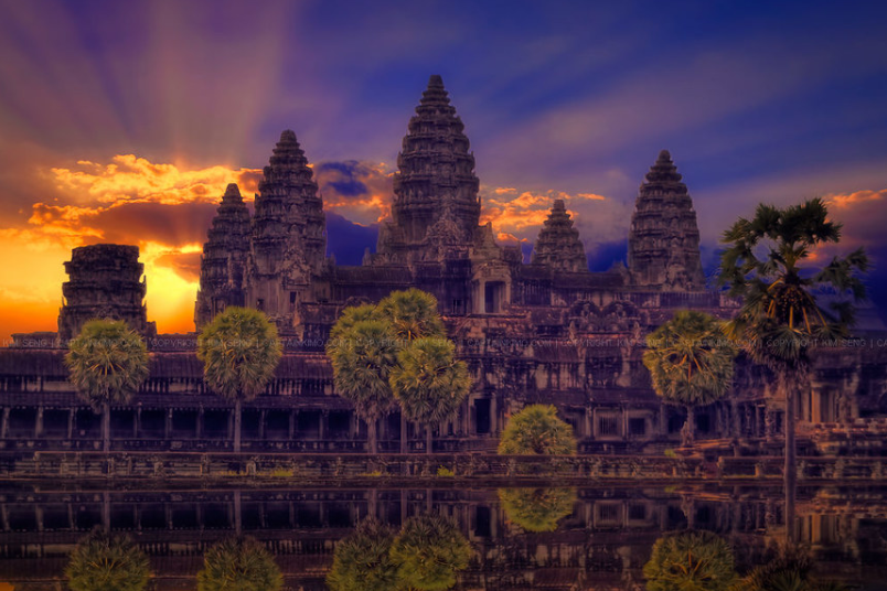 Kamboçya’nın tropik ormanları içinde gizlenmiş Angkor Wat, 12. yüzyılda Khmer hanedanı tarafından inşa edilen dünya’nın en büyük dini yapılar topluluğudur. Tapınağın katmanlı kule formu, Hindu kozmolojisini temsil ederken, duvarlarındaki kabartmalar epik anlatılarla doludur.