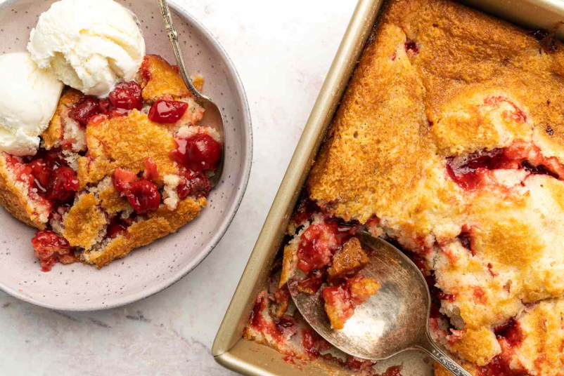 - Meyveleri fırından çıkarın, hamur toplarını eşit olarak meyvelerin üzerine yerleştirin. Üzeri altın rengi alana dek 25–30 dakika pişirin. Ilık veya soğumaya yakın vanilyalı dondurma ile servis yapın.