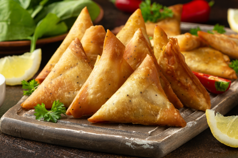 Samosa, çıtır hamurun içine baharatlı patates, bezelye ve bazen kıyma doldurularak üçgen biçimde kızartılan veya fırınlanan pratik bir atıştırmalıktır. Dış kabuğun gevrekliği ile iç harcın baharatlı, hafif ekşi ve sıcak dokusu arasındaki uyum, sokak satıcılarından çay saatlerine kadar geniş bir tüketim alanı sağlar ve farklı bölgelere göre dolgusu ve soslarla eşleştirilişi değişir.